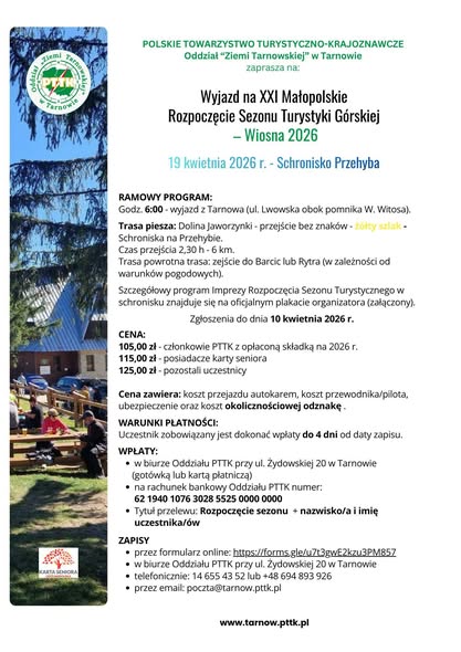 Wpłaty i zapisy w PTTK Tarnów (Informacje na plakacie)